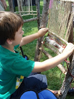 Terra looms are a perfect place for kids to lose themselves in creation. They choose their special things to weave in and then they just.... weave. At two and a half, the boy on the right developed his own style of just grabbing a bunch of strings together and wrapping the yarn around it. We decided to do the same all the way across and realized that it was a "pattern" and could be used to tie on things like beads. These moments were the most gratifying for us at the craft fair, because we could really demonstrate our products with the public.